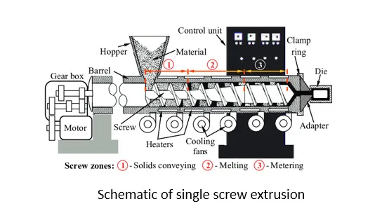 เครื่องอัดรีดสกรูเดี่ยว (Single-screw extruder ) ในปัจจุบันเครื่องอัดรีดแบบสกรูยังคงเป็นรูปแบบหลักของการผลิต เนื่องจากง่ายต่อการผลิตและต้นทุนอุปกรณ์ราคาถูก รวมถึงการควบคุมกระบวนการในระหว่างการผลิตที่ไม่ซับซ้อน