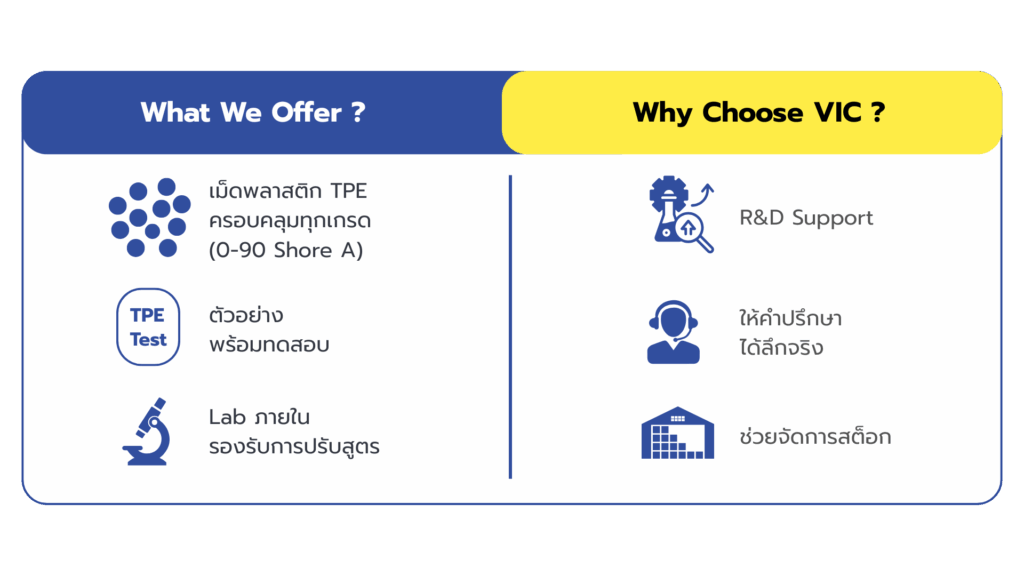 ในการส่งออกสินค้าไปยังยุโรปและอเมริกา การเลือกใช้วัสดุที่ผ่านมาตรฐานความปลอดภัยและสิ่งแวดล้อม เช่น RoHS หรือ REACH ถือเป็นเรื่องสำคัญ — TPE จึงกลายเป็นวัสดุทางเลือกที่เหนือกว่า PVC ด้วยคุณสมบัติที่ไร้สารพาทาเลต (Phthalate-Free), รีไซเคิลง่าย และปลอดภัยต่อผู้ใช้งาน เหมาะสำหรับอุตสาหกรรมที่ต้องการความเชื่อมั่นจากผู้บริโภค เช่น ของเล่นเด็ก, อุปกรณ์การแพทย์ และสินค้าผู้บริโภคทั่วไป VIC พร้อมให้คำแนะนำในการเลือกใช้วัสดุที่ตรงตามข้อกำหนด พร้อมสนับสนุนให้ธุรกิจของคุณก้าวสู่ตลาดโลกอย่างมั่นใจ